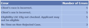 Shows the errors that exist in the system (as of the moment the report is run) and the name of the person who is shown the error. Also shows the number of errors by staff person, and the number of times each error is made. This information can be helpful in assuring errors are being corrected in the system, as well as knowing what type of training may be necessary.