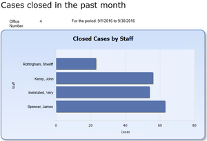 This report requires the entry of an office number. Staff who closed cases in the last month are displayed together with the number of cases they closed during that month. Quickly compare case closures within an office, across staff in that office.