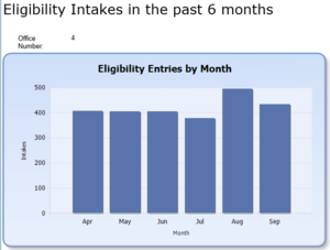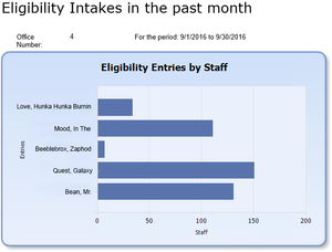Shows the number of intakes by a staff person in an office. This report does require the entry of office number to run. Compare intake staff in an office.