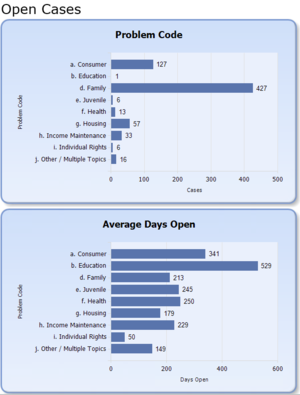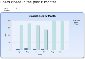 Shows the cases that were opened and closed during each month over the last three years. One graph shows the cases closed during that month. The other shows the cases opened during the month. This can be helpful in diagnosing staff changes or other issues that may be represented by a remarkable change in opening and closing cases.