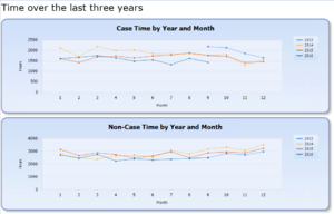 Shows the total of time broken down into two graphs. One shows case time by month; the other non-case time by month. As it covers the last three years, it gives management an idea of how time is being spent on case handling versus non-case time. This can be helpful in diagnosing problems, especially if case time should inexplicably dip. The three-year duration gives a baseline against which you can compare the time breakout.