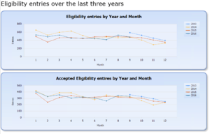 Shows the total eligibility intakes made by the program over the last three years. A second graph shows the eligibility entries that were accepted (where the application went beyond the eligibility stage). Like other reports, this can help management in determining whether there are efficiency issues that may exist in the organization.
