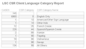 A new report is available to help with LSC CSR reporting. For client reporting, this report will take entered languages and break them down into the categories within the CSR Report.