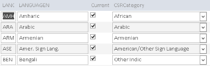 To do this, a new table is added with the CSR language categories. A new field is added to the language table to link existing entries to those categories. When installed, standard, three-letter entries are automatically categorized for you to help save you time (e.g., the “ENG” entry for English, is put in the “English Only” category). Older versions using a single letter entry (such as “E” for “English”) are not automatically categorized.