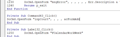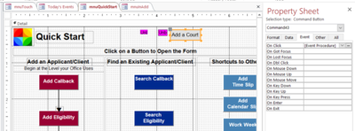 We go back to the Quick Start form, click on the Add Court button and then look at the Event properties for On Click. When we push the three dot button it opens the code window.