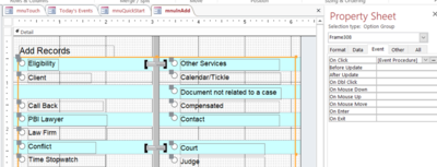 We know there are choices on the old book to add things. Open the mnuInAdd form in design mode. Click on the button that says Court. We see that it returns data of 19 (under the data tab), which means it’s a part of an option group rather than a single button. We click on the surrounding box, here in orange, which selects the option group Then go to the On Click event in properties and click on the button at the end of the row with three dots.