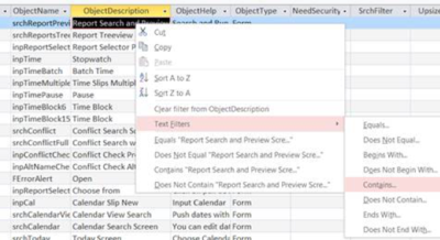 1. Finding the tile you want to change To modify a tile using the table, you first need to find the row that controls the tile. Right click on entry in the ObjectDescription column. Then choose Text Filter from the menu that appears and select Contains. You can then type in the label that appears on the tile you want to modify. For example you could look for ‘Eligibility New’.