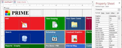5. Modifying or Adding a Tile to the Quick function a. To modify a tile in the Quick column, proceed the way that you did under 4.a. above. b. To add a new Tile, select a tile in the Quick column, copy it and then paste it on the screen. Move the tile where you want it to show up. You may also want to change the size. Next change the color of the tile and the label to reflect what you want it to do. Lastly you need to add code to the choice under the On Click event. This could either be an existing call that exists in the ToolbarsFunction such as: Call TileAction("TClientSearch") Or it could be direct code that opens the form, query or report directly, such as: DoCmd.OpenForm "srchClientsQuick", , , "casenum = ""ml""", acFormEdit If you open the ToolbarsFunctions module in the design mode, you can see a list of these command lines. 6. Modifying or Adding a Tile to the Quick function a. To modify a tile in the Quick column, proceed the way that you did under 4.a. above. b. To add a new Tile, select a tile in the Quick column, copy it and then paste it on the screen. Move the tile where you want it to show up. You may also want to change the size. Next change the color of the tile and the label to reflect what you want it to do. Lastly you need to add code to the choice under the On Click event. This could either be an existing call that exists in the ToolbarsFunction such as: Call TileAction("TClientSearch") Or it could be direct code that opens the form, query or report directly, such as: DoCmd.OpenForm "srchClientsQuick", , , "casenum = ""ml""", acFormEdit If you open the ToolbarsFunctions module in the design mode, you can see a list of these command lines.