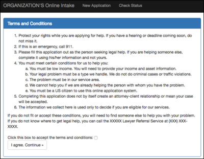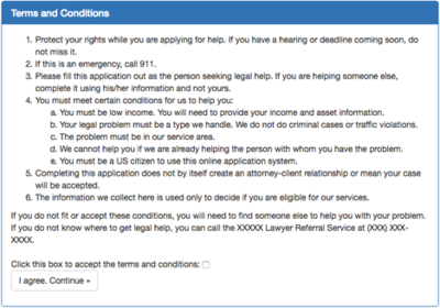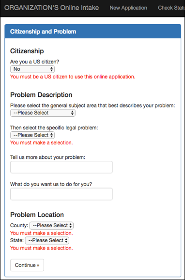 Figure 6 - "You must agree" warning The first page of the application is geared toward getting basic information about the person, including their citizenship status and the type of problem they have. If they mark that they aren’t a citizen, they won’t be allowed to continue on. Additionally, we can verify their problem in the organization’s service area. Various questions throughout the application process are required. Failure to enter information in those fields results in error messages next to the required item: