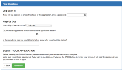 On the final page, we get a password from the applicant that they can use to log back on to the system to get the status of this application. We also get information about how they came to know about us: