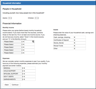 Figure 11 - Page Four - Household information At least one “Income” item must be filled out, even if they set the type to “None” and enter a zero in the amount box. All five asset boxes are required to have some amount entry in them. Like most parts of the system, these pages may be modified to omit various questions.