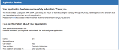 Figure 12 - Page five of the application Once the application is submitted, the applicant is shown an “Application Received” page, giving them various information about the application, including the application number they will need to log back in to get the status of their application, and the entries they made in the application: