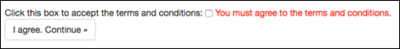 Figure 5 - Terms and Conditions Page Only after the applicant selects the checkbox, indicating they accept the terms and conditions, will they be allowed to proceed to the application. Pressing the “I agree…” button, without checking the box, results in a reminder that they have to accept the terms: