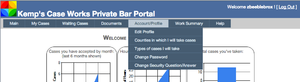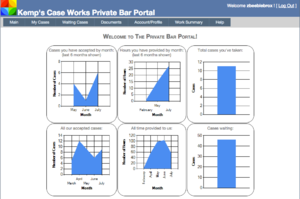 Once an attorney logs on, they are taken to the main menu page. This enhanced page has a dashboard showing various charts relating to the past cases they’ve taken, as well as information on the organization itself. An example dashboard is shown in Figure 4.