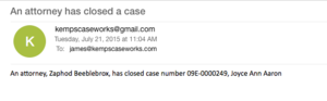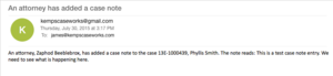 - An email is sent to the organization notifying staff of the fact that the attorney took the case, as shown here