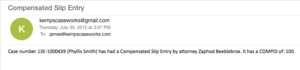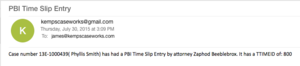 When an attorney adds either Compensated or PBI Time to a case, staff will receive an email much like that shown in Figure 54 (for Compensated Time) and Figure 55 (for PBI Time).