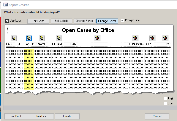 9) Here we’ve selected Add Column and we are going to put the Case Type field in. We also asked to be prompted for the title when the report runs. Because we want the new column to stand out, let’s change its color. Click on the Change Colors button and select yellow.