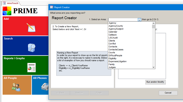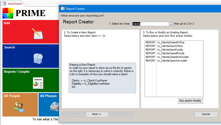 4) Once we choose a record source, reports already built using that record source show up. We can run a report, modify it to meet our need, and then save it under a new name. We can also start a new report.