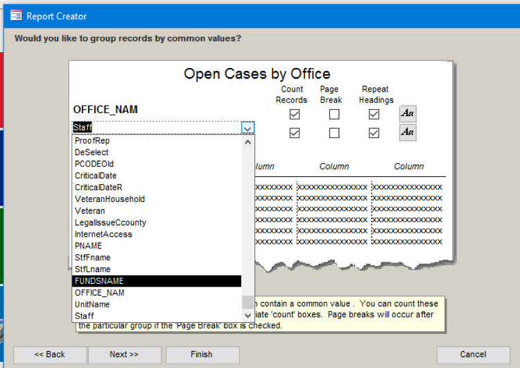 11) If we choose Next, the screen allows us to choose how we want to group the information that shows up. Let’s change it from Office and Advocate to Office and Funding Code. We’ll choose the Funding Code name rather than number.