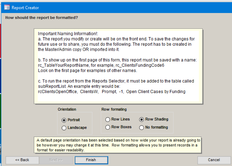 2) This opens up the Report Creator page. What we now need to do is select the record source of the report. If we followed the naming convention, supporting queries begin with qrc_ and reports begin with rc_. The system will now show the reports already generated using that record source.
