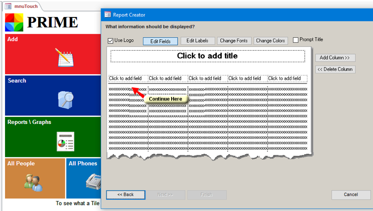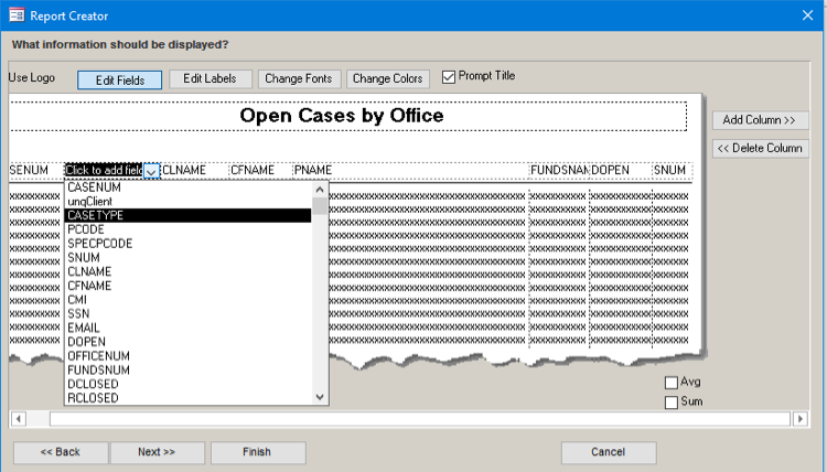 5) The first screen we see allows us to choose what columns to include, change their fonts, change the colors, add sums, averages, and either hard code a title in or allow the program to prompt us for one.