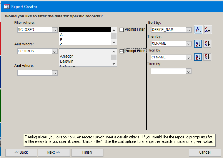 13) When we press Next, we get to choose the criteria for the report. This can be hard-coded in, so that it never changes, or we can choose to be prompted for a value. By choosing a blank value for Rclosed (reason closed), it will only use open cases. Here we changed from being prompted (notice the check) for the Offices to being prompted for a County. Sort Order can also be changed here.