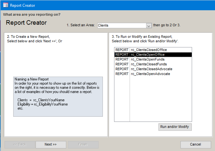 6) Building a new report is very similar to modifying an existing one. Let’s pick one to modify so most of the choices have been made. Here we chose Client Open by Office.