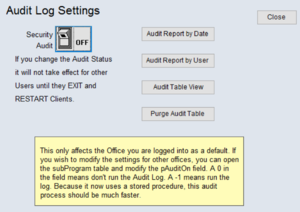 a) Audit Log – Turns an Audit Log that provides reports and maintenance on the table that is created on and off. You can run audits by Date or Staff Member. If you use this feature, you will want to make sure that it is cleaned out on a regular basis. The Error Alert that starts when you open Prime has an error message that appears if the number of listings in the tblLog table exceeds 150,000 records.