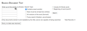- ii) For documents stored in the SQL Server, you can search for documents that contain a particular word or words. Only those documents that are capable of being “read” by the SQL Server will be available here. Those most frequently recognized by SQL are office documents. PDF documents that are not based on images (i.e., they have selectable text within them) can be recognized by SQL, but will most likely require additional setup on the server. Images, pictures, and documents that do not have text in them are not searchable using this feature