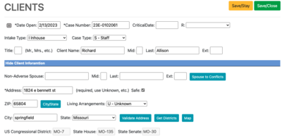 To use the system, within a client record, ensure the address, city, state, and zip code are entered for the client. Press the "Get Districts" button to have the system look up the political districts. If successful, the districts should appear. They will be saved to the client record. If an address is later changed and you wish to change the political districts to reflect the new address, press the "Get Districts" button again after the change.