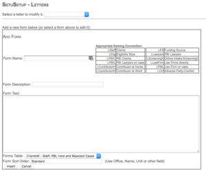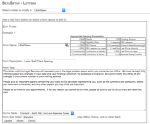 Lets you edit the text in existing form letters or add new letters to the list. From the pull down menu, choose the letter you want to change. Edit the text and/or the description of the form. Press Update to save your changes.