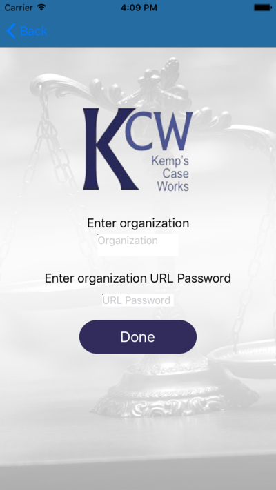 The Organization Identifier is used by the Phone App to know which organization it is attempting to connect. The Identifier will be provided by Kemp's Case Works upon setup of your Phone App service. Except in the event of a major emergency, it will not change.