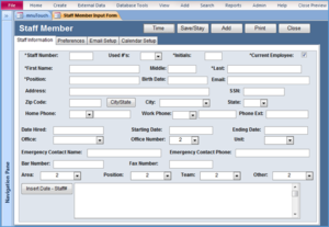 The Staff Member input form allows you to add staff members to the database. After adding staff members, you must next assign staff roles (Described in later in this section).