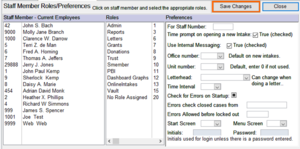 Also located under Admin Staff Settings is Staff Roles. Prime doesn’t prompt for passwords when trying to use restricted functions. Rather each staff member is granted permission to use certain features by setting their ‘role’. Prohibited functions will either not appear or appear grayed out. For example, Clarence W. Darrow is given the role Admin 1, which allows him to see all of the restricted features in Prime. Richard Simmons can be given Roles 7 and 8, allowing him to use the Grants and Donations features.