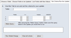 4) Set Criteria Run the Update – Go to this last tab to Set the criteria that determine which records get changed. Then generate the query by clicking Make Query. You will see the query language in the box. Review it to see the data that will be changed
