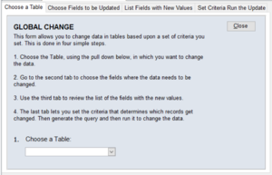 – The form allows you to change data in tables, such as Clients or Eligibility, based upon the set of criteria you set. It is an alternative to an Update Query.