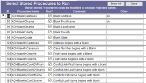iv) Choose Stored Procedures – Opens up a Select Stored Procedures to Run form that allows you to select or deselect which stored procedures to run. For example, if your program does not do Time Keeping, you would uncheck all of the stored procedures having to deal with time keeping. Tip: Instead of scrolling through the list, right click on a comment and choose Text Filters then Contains. You then type in the word you are looking for and all the titles that match show up.
